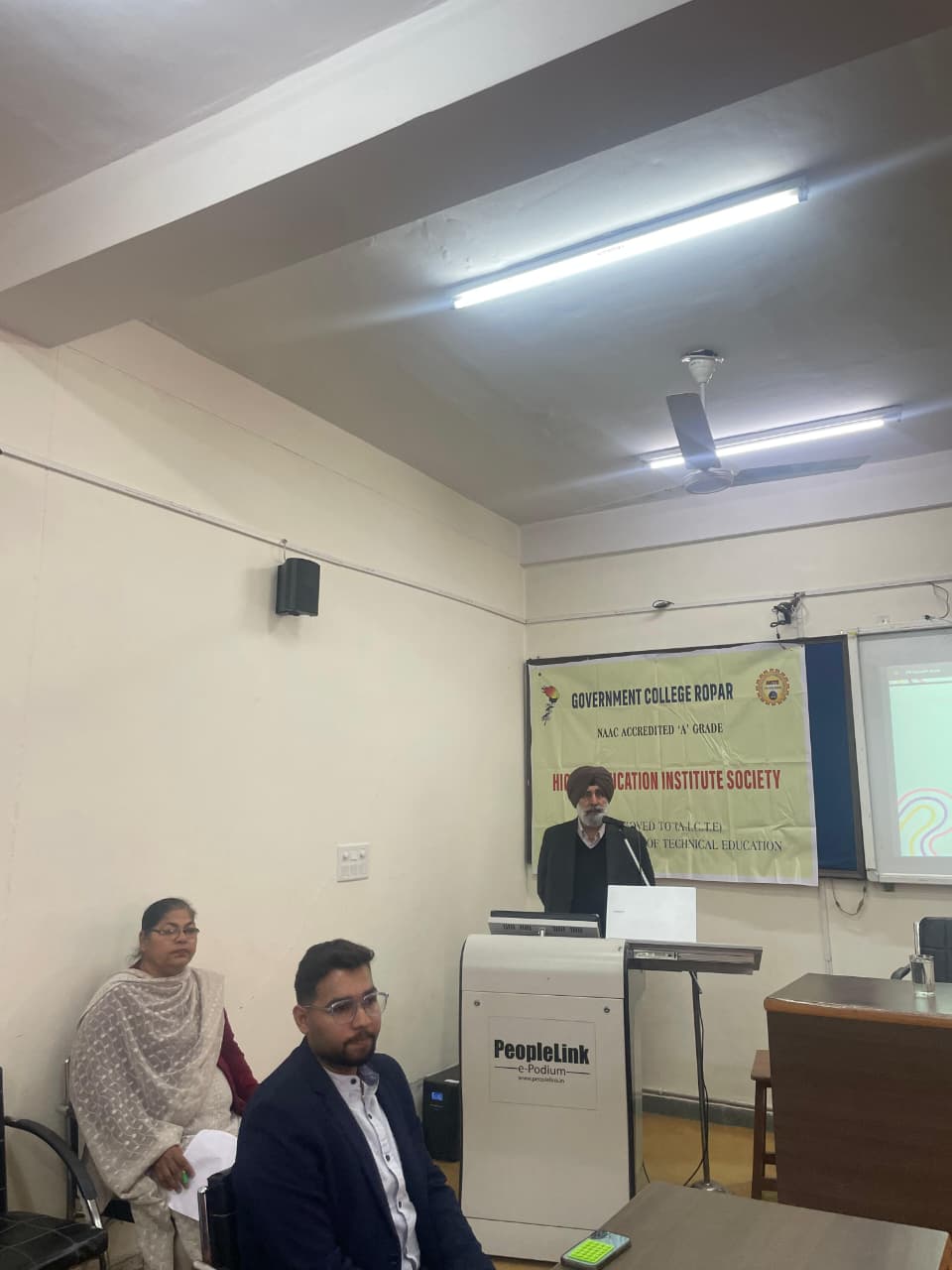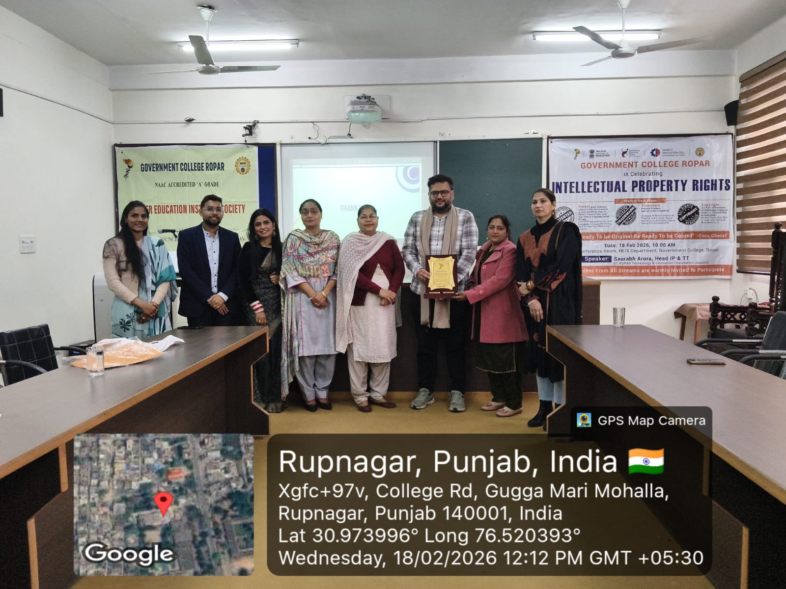 ਸਰਕਾਰੀ ਕਾਲਜ ਰੋਪੜ ਵਿਖੇ ਭਾਰਤ ਸਰਕਾਰ ਸਿੱਖਿਆ ਵਿਭਾਗ ਦੇ ਦਿਸ਼ਾ ਨਿਰਦੇਸ਼ਾਂ ਤਹਿਤ ਆਈ ਆਈ ਸੀ ਸੈੱਲ ਵੱਲੋਂ ਆਈ ਪੀ ਆਰ ਕਮੇਟੀ ਦਾ ਇੱਕ ਵਿਸ਼ੇਸ਼ ਸੈਮੀਨਾਰ ਪ੍ਰਿੰਸੀਪਲ ਜਤਿੰਦਰ ਸਿੰਘ ਗਿੱਲ ਜੀ ਦੀ ਰਹਿਨੁਮਾਈ ਹੇਠ ਕਰਵਾਇਆ ਗਿਆ। ਇਸ ਸੈਮੀਨਾਰ ਦੇ ਮੁੱਖ ਬੁਲਾਰੇ ਸ੍ਰੀ ਸੌਰਵ ਅਰੋੜਾ ਮੁਖੀ ਬੌਧਿਕ ਸੰਪਤੀ ਅਤੇ ਤਕਨੀਕੀ ਟਰਾਂਸਫਰ ਵਿਭਾਗ ਆਈ ਆਈ ਟੀ ਰੋਪੜ ਨੇ ਵਿਸ਼ੇਸ਼ ਤੌਰ ਤੇ ਸ਼ਿਰਕਤ ਕੀਤੀ।